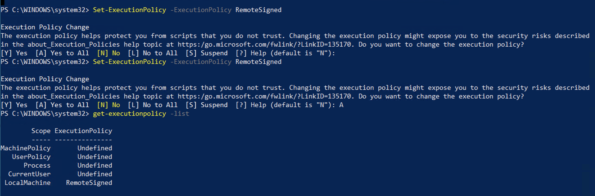 Set-ExecutionPolicy -ExecutionPolicy RemoteSignedcommand and it changed LocalMachine scope to RemoteSigned.