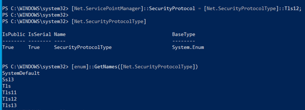 [System.Net.ServicePointManager]::SecurityProtocol = [System.Net.SecurityProtocolType]::Tls12