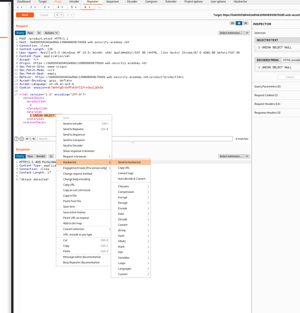 It now says attack detected & Observe that your request has been blocked due to being flagged as a potential attack..  So we need to Encode this UNION SELECT NULL and then try.